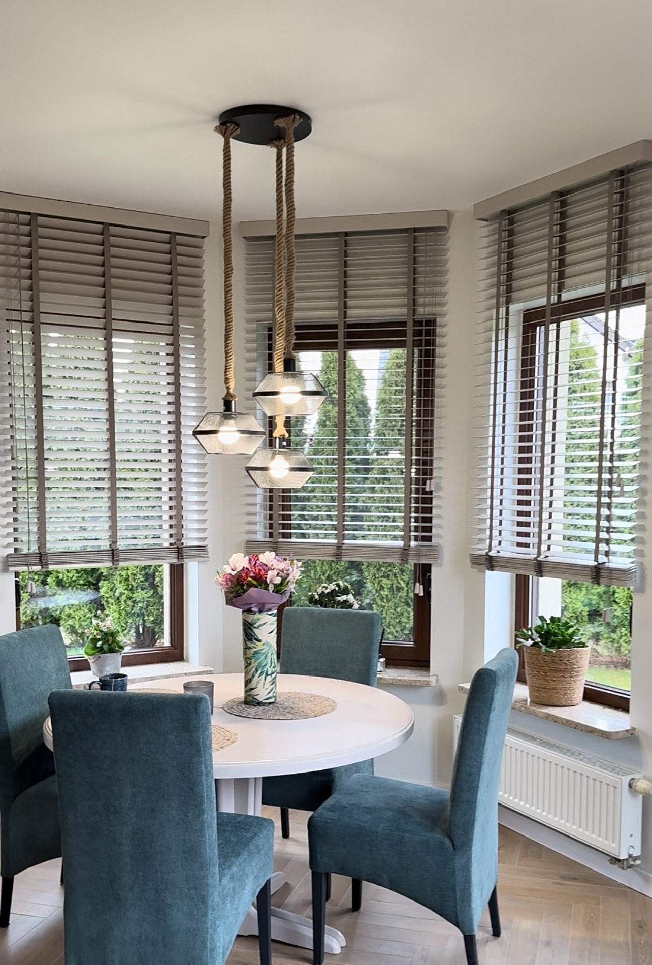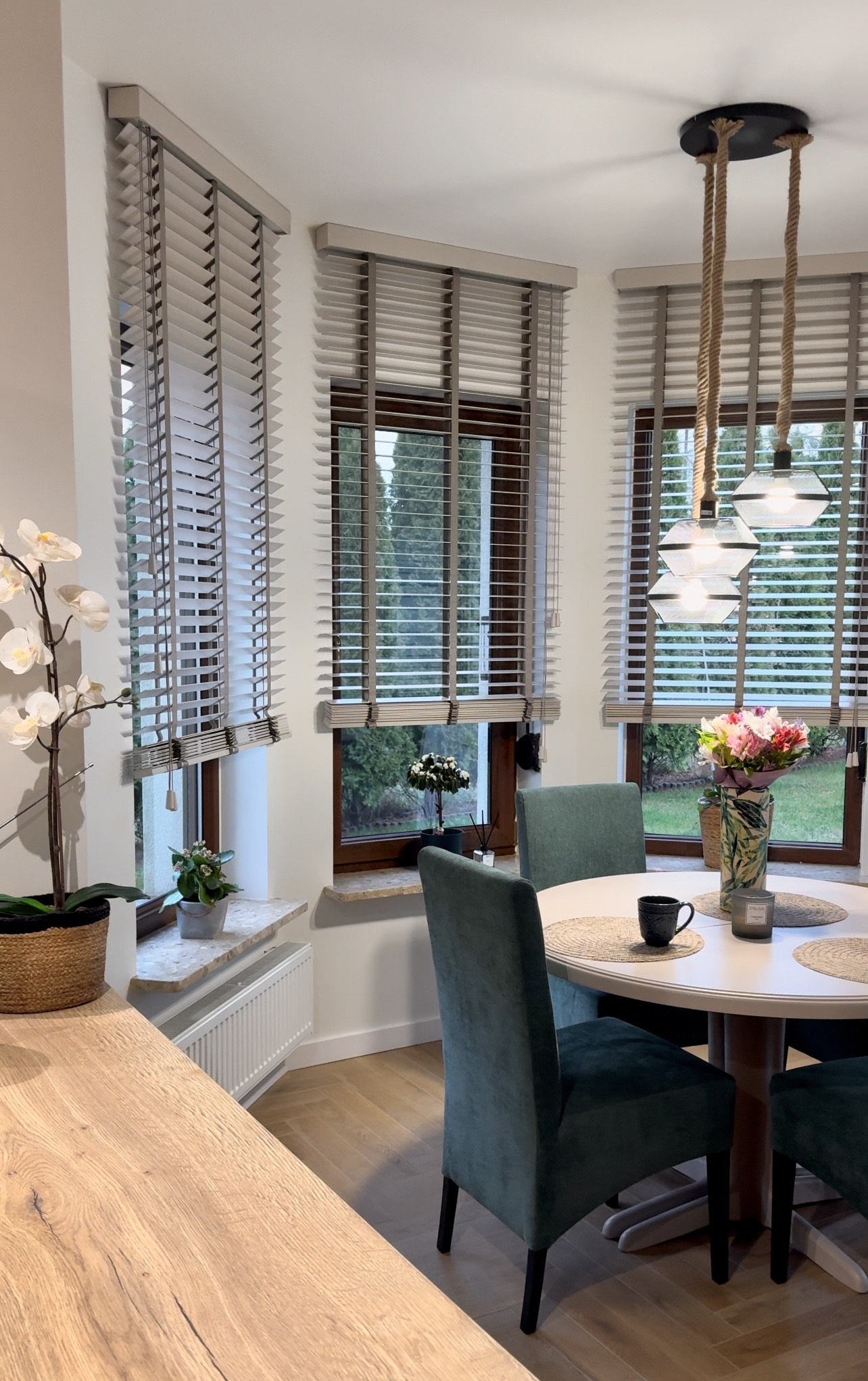 Wykuszowe okno z żaluzjami zyskuje nowoczesny wygląd, a całość prezentuje się lekko i estetycznie. To rozwiązanie praktyczne, trwałe i łatwe w utrzymaniu.