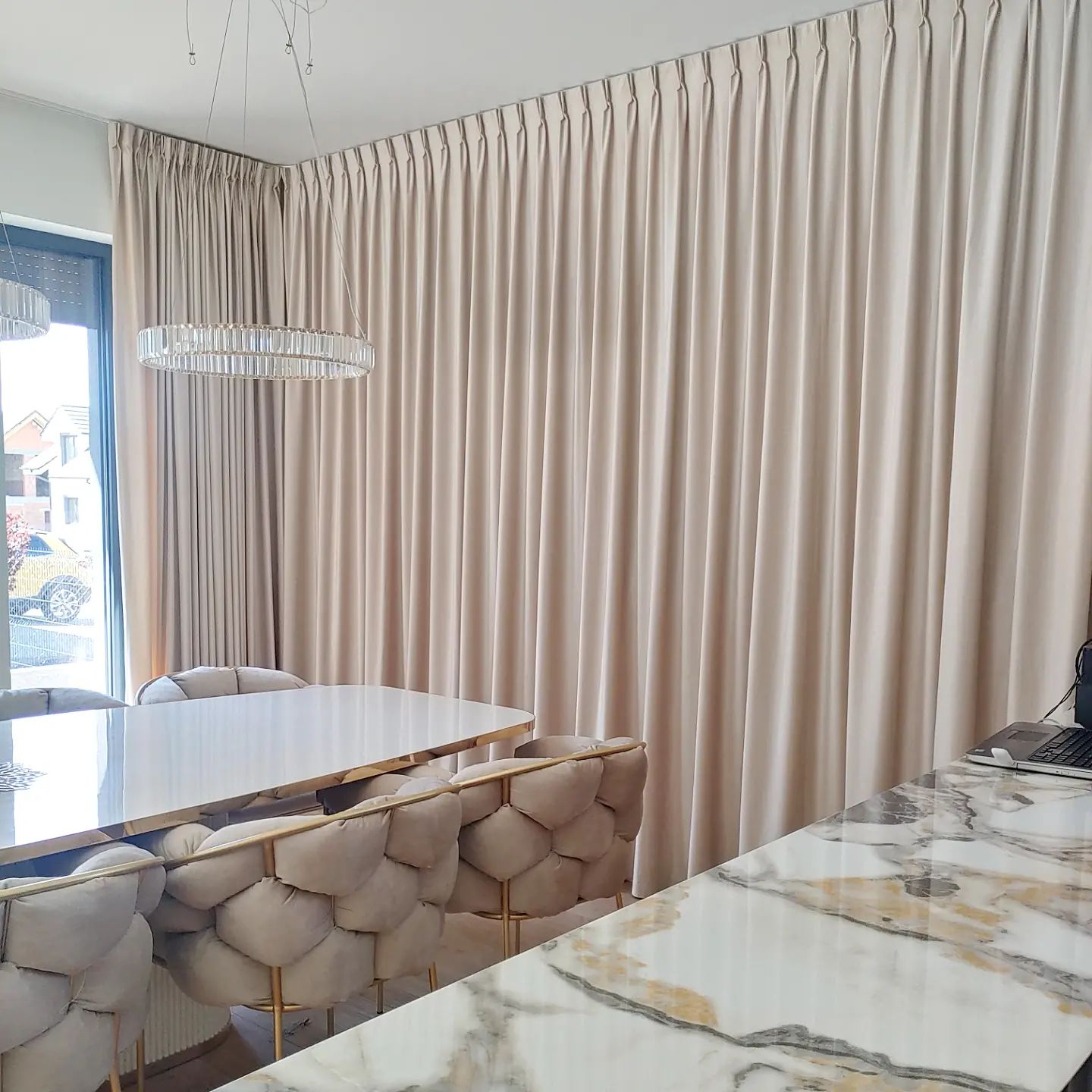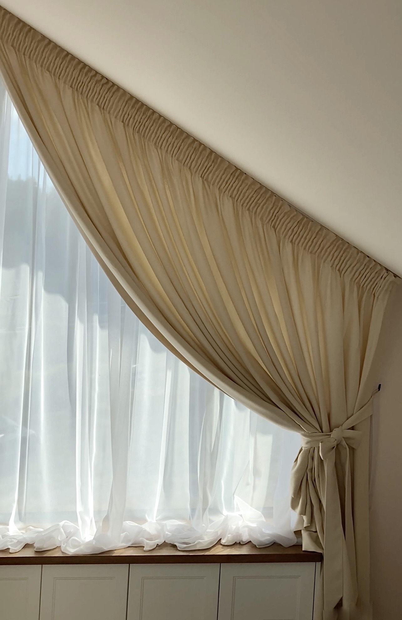 Beżowe zasłony i białe półprzejrzyste firany na czarnej szynie sufitowej