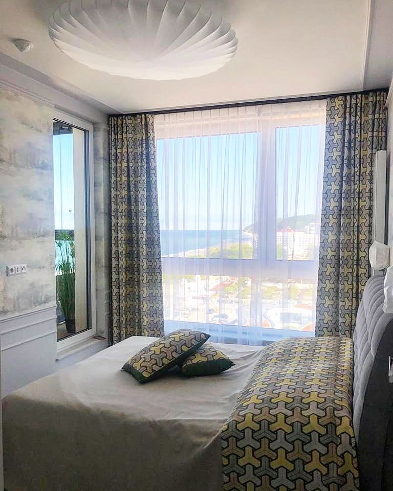 Dekoracje z ekskluzywnych wzorzystych tkanin w apartamentach nad morzem